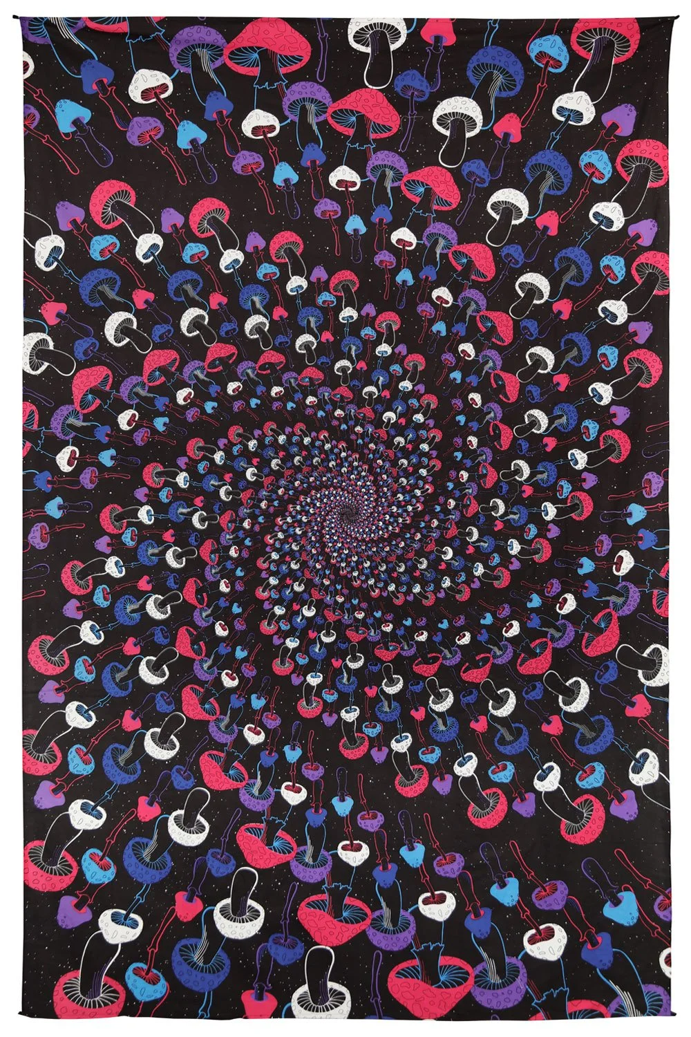 This 3-D glow in the dark shroom spiral mini tapestry measures 30x45 Inches. A magic multitude of mushrooms spiral into the unknown on this psychedelic tapestry made with 3D effects. Artwork appears to float of the fabric when viewed through special included 3D glasses. Measuring approximately 2.5 feet by 3.75 feet, this trippy tapesty features corner loops to display and is made of 100% cotton.